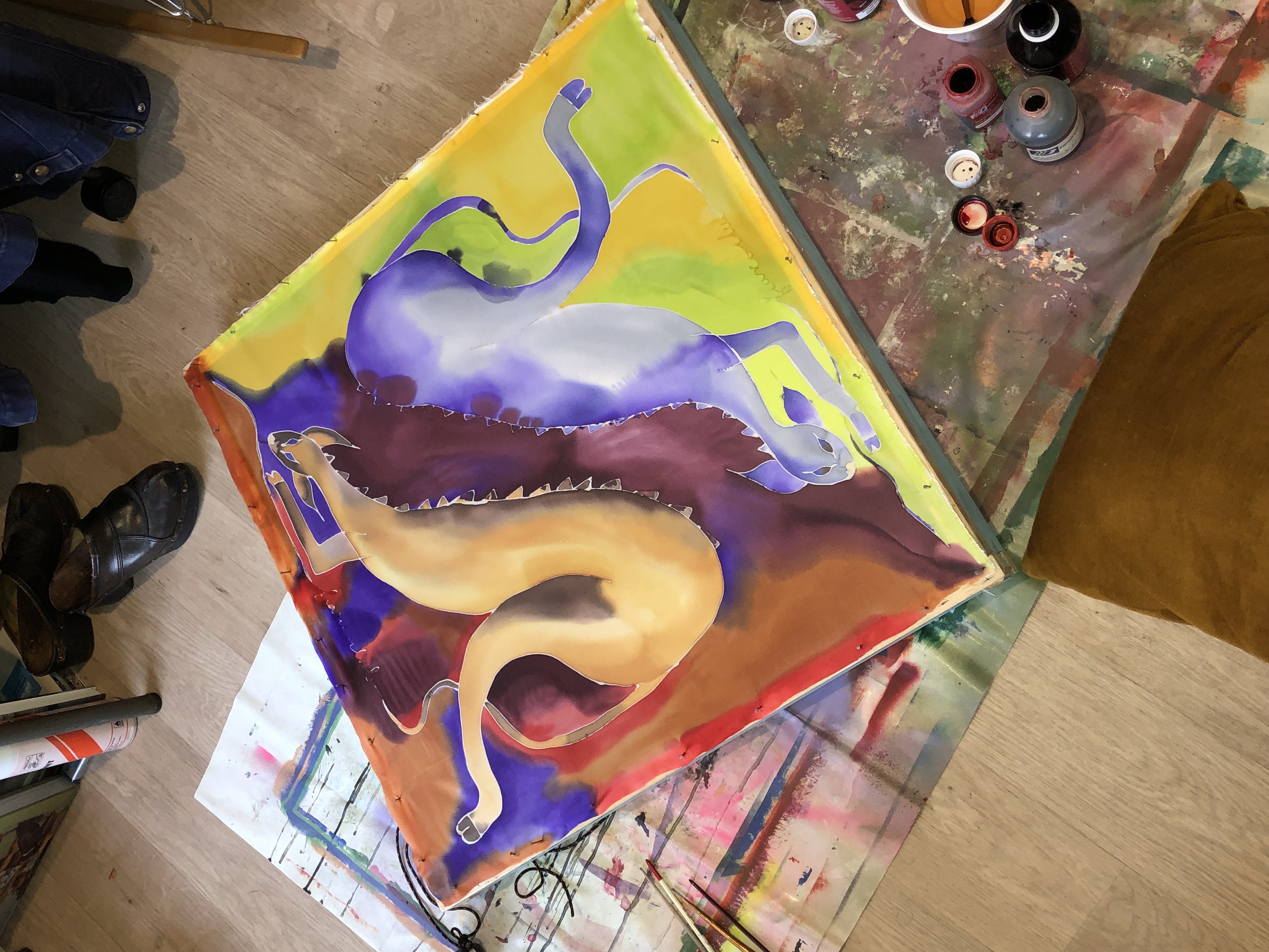 Le textile, plus particulièrement la soie est mon médium de prédilection, terrain de jeu d’expérimentation de la couleur. A travers ce projet, je souhaite proposer un dessin issu de mon bestiaire personnel imaginaire. Chimères et natures mortes s’y mêlent, mise en scène d’une mythologie du quotidien, triviale et fantasque.